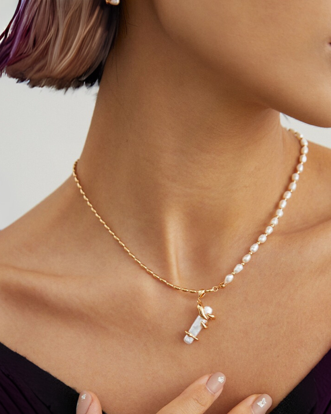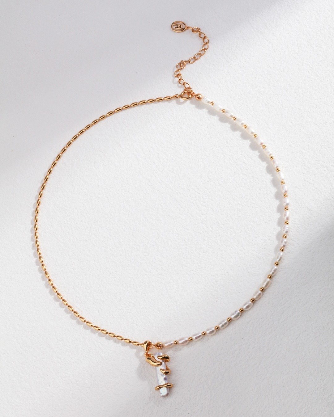 Bold and balanced, the Ignara Dual Strand Pearl Necklace brings harmony to contrast. One half glows with polished 18K gold vermeil chain, the other with organically shaped freshwater pearls — all anchored by a Baroque pearl pendant, wrapped in gold like flame in motion. It’s a powerful piece made to reflect your duality — soft and fierce, elegant and modern, calm and unstoppable. Modern dual-strand necklace with half pearls, half gold, and a sculptural wrapped pendant. Designed to embody balance and inner fire.