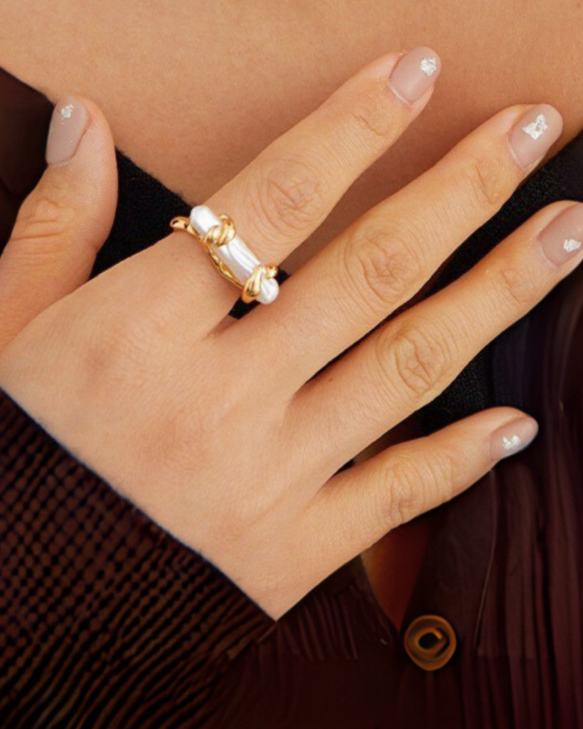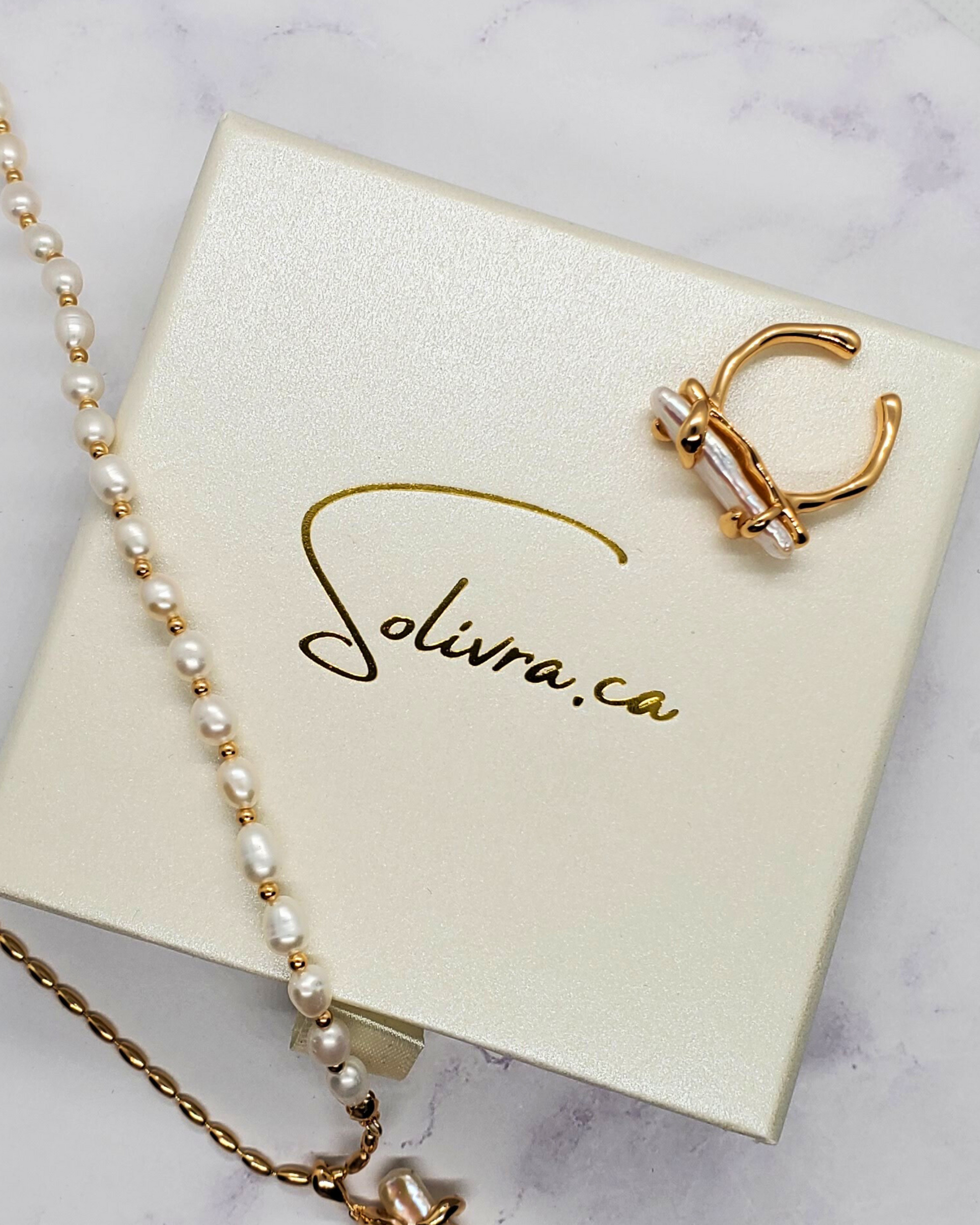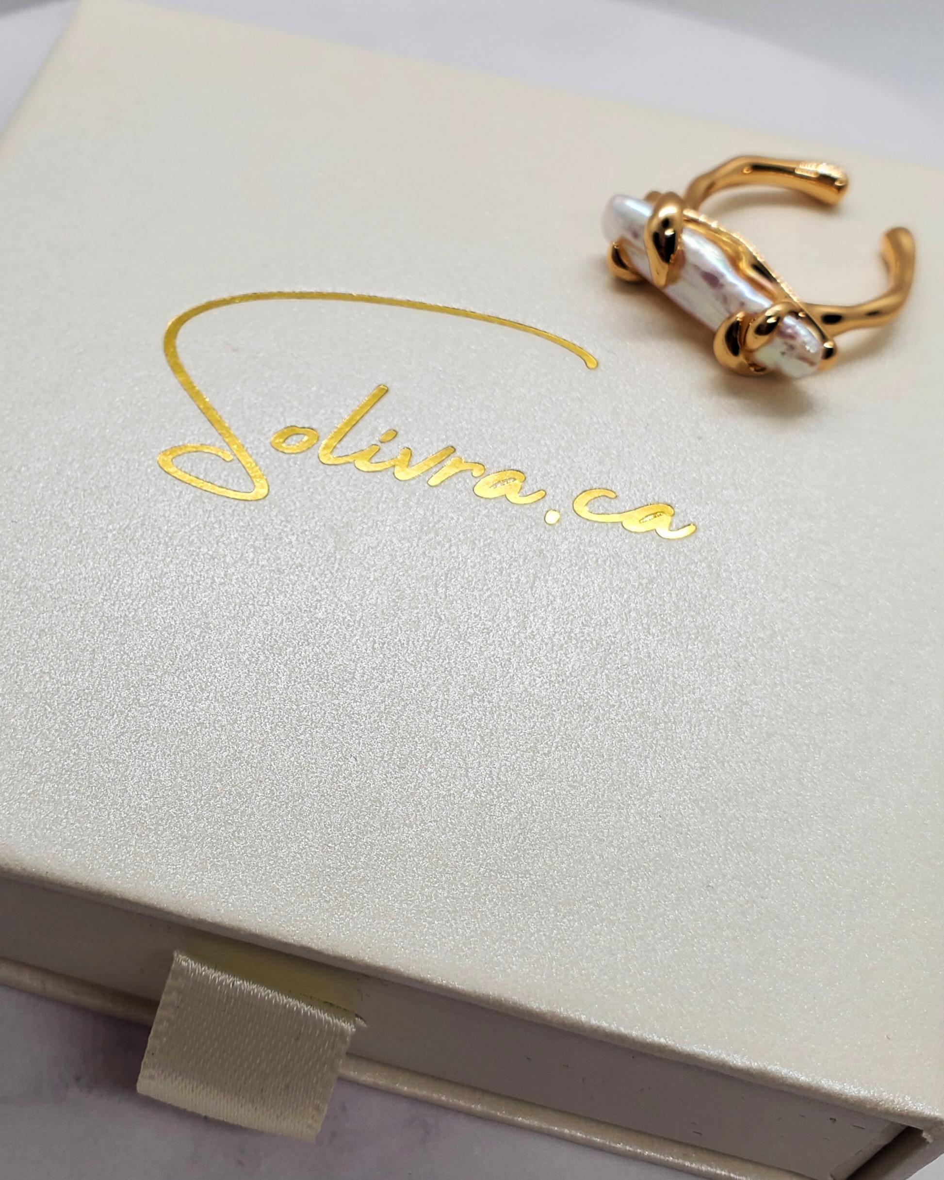 A baroque pearl wrapped in sculpted gold, on an adjustable band. Bold, feminine, and uniquely yours.